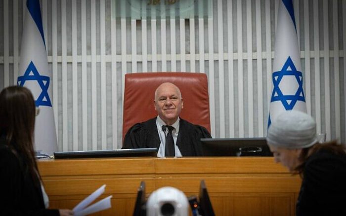 Судья Верховного суда Узи Фогельман в Верховном суде в Иерусалиме перед началом слушаний о законе об усыновлении детей, 2 августа 2023 года (Yonatan Sindel/Flash90)