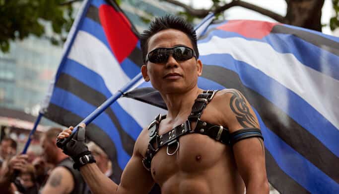 Флаг Кожаной гордости был создан художником Тони ДеБлейзом (Tony DeBlase) и был впервые продемонстрирован 28 мая 1989 года в Чикаго на конкурсе «Мистер кожа». Он является символом сообщества людей — поклонников БДСМ. Этот флаг часто появляется на парадах и других мероприятиях ЛГБТ, но он используется людьми обеих ориентаций