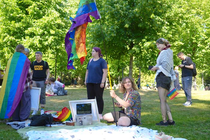 Прайд организован в Хельсинки таким образом, что сначала происходит парад, который идет от площади до парка. Далее, в парке люди могут пообщаться с некоторыми организациями в представительских тентах, но большинство устраивают пикники. Мы не раздобыли собственного тента, поскольку они обычно представляются только крупным партнерам, поэтому просто разместили свое место рядом. Для того, чтобы люди понимали, что мы презентуем что-то, мы сделали большие вывески с надписями. Также, мы подготовили материалы с краткой выжимкой о том, что происходит в России и QR-кодами на сайты с докладами о ситуации для подробного изучения. Мы проигрывали аудио с колонкой и тем, кому так было удобнее, предлагали читать крупные субтитры на компьютере.