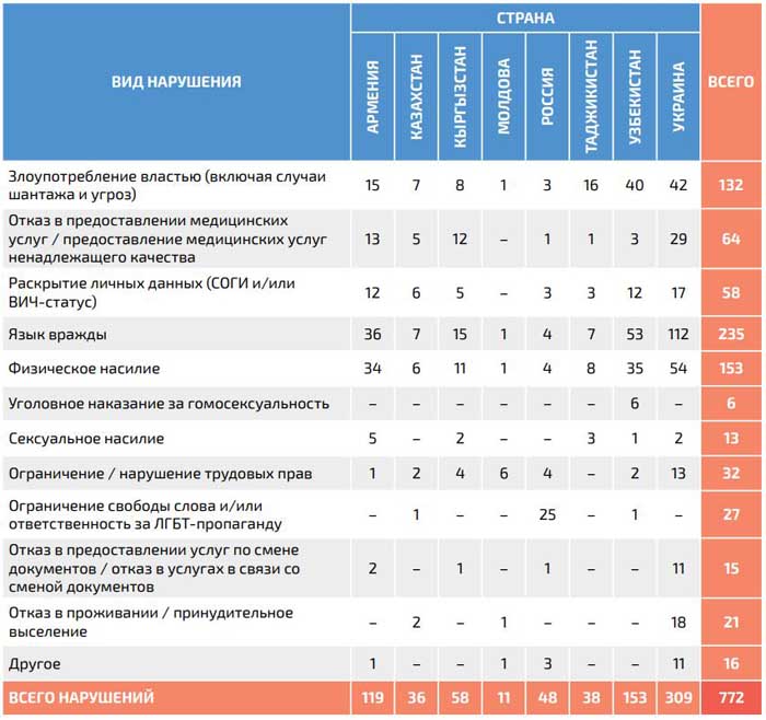 В тройке наиболее распространённых видов нарушений — язык вражды по отношению к ЛГБТК-людям (235 случаев), физическое насилие (153 случая) и злоупотребление властью, включая шантаж и угрозы (132 случая). Последнее проявлялось в разных странах по-разному. Где-то это беспредел со стороны силовиков, где-то — недопустимое поведение медиков. Всё более распространяются подставные свидания, куда негодяи заманивают квиров, а затем избивают, унижают, отбирают деньги и так далее. А в Узбекистане до сих пор по 1220 статье УК предусмотрено ограничение свободы за гомосексуальность (запрет покидать город, пользоваться Интернетом и пребывать на улице в ночное время). Попав в руки силовиков, квиры там подвергаются жутким издевательствам, их права никак не защищены.