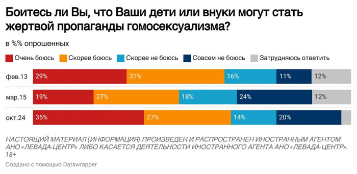 Опрос также выявил, что почти две трети респондентов выражают опасения по поводу так называемой «пропаганды гомосексуализма», считая, что их дети или внуки могут стать жертвами такого влияния. Эти страхи, возможно, коренятся в недостатке информации и распространении стереотипов о ЛГБТ-сообществе.