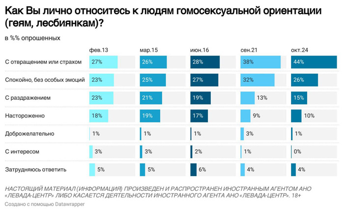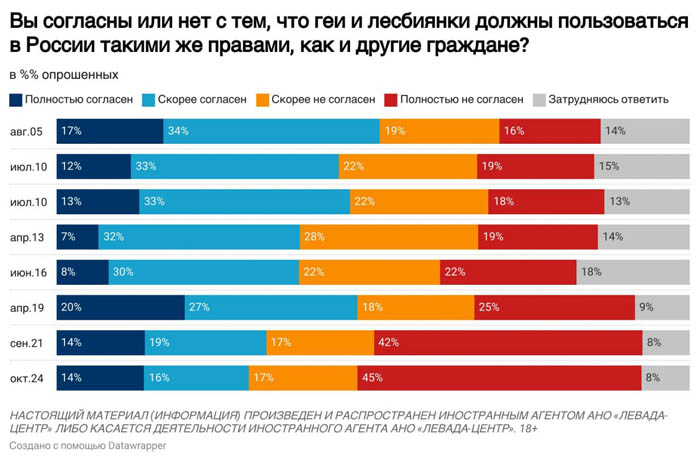 Долгосрочные тренды показывают значительное снижение поддержки прав гомосексуалов и лесбиянок. За последние два десятилетия доля россиян, считающих, что ЛГБТ-люди должны пользоваться такими же правами, как и остальные граждане, сократилась с 50% до 30%.