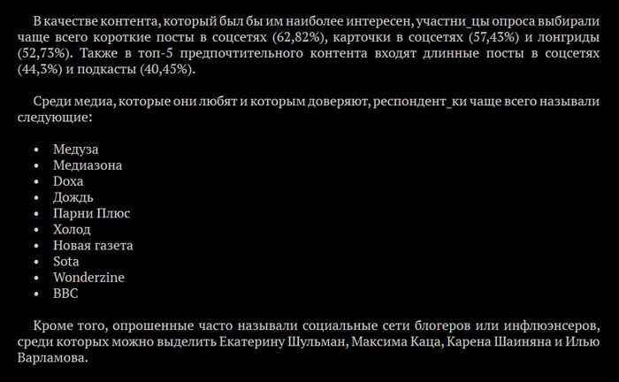 «Результаты нашего исследования показывают, что война, усиление репрессий, новые гомофобные и трансфобные законы значительно повлияли на жизнь ЛГБТК+ людей. Они чаще чувствуют себя в опасности, ведут себя более осторожно и закрыто, избегают открыто писать о себе в соцсетях или посещать места, где их могут считать как ЛГБТК+ персон. Это сказывается на их практиках потребления контента, досуга и знакомств: возможностей для всего этого становится значительно меньше. Кроме того, существенно осложнился доступ к ЛГБТК+ контенту и объективной информации о гендере и сексуальности», — пишут авторы.