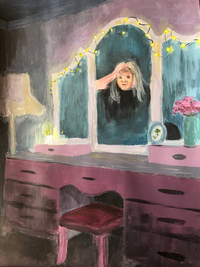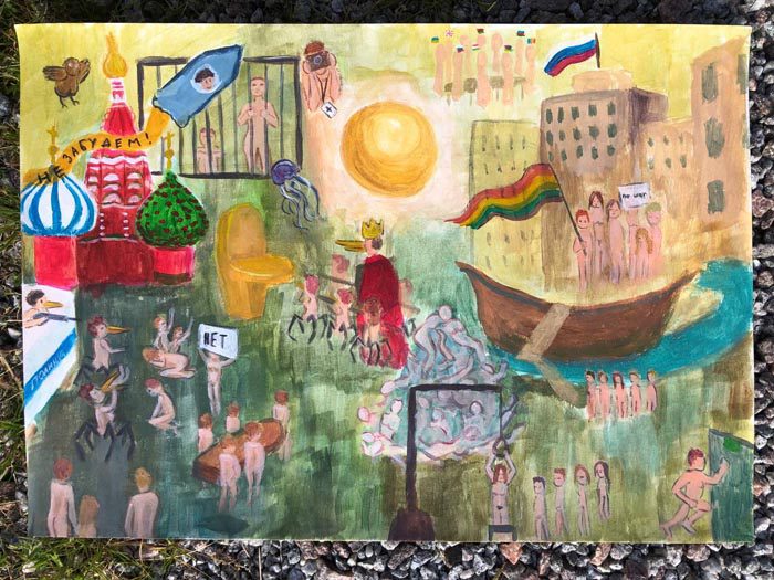 Моя работа называется “In my head”, выполнена акрилом на бумаге формата А3. На картине изображен хаос современного мира, который я не могу выкинуть из головы: политическая ситуация в России, поднявшийся уровень самоубийств среди подростков, жертвы войны, коррупция, политзаключенные, Навальный, протесты, вынужденные эмигранты, независимые СМИ и правозащитные организации. Подробнее вы можете почитать описание на сайте выставки.