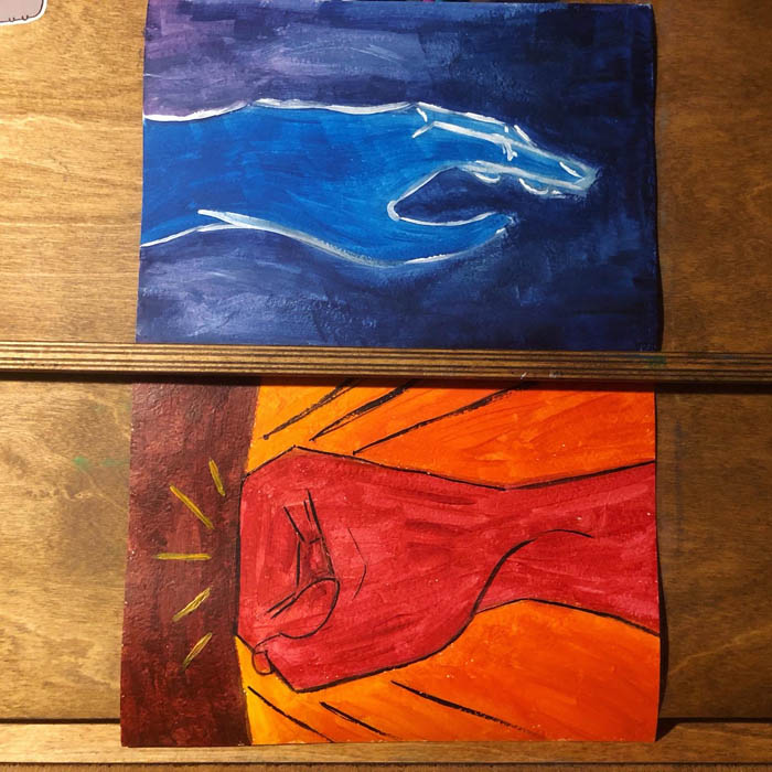 Следующая лекция была про цвета: мне лично показалась менее интересной, потому что я уже неплохо разбирался в теме. Но все равно было полезно послушать еще раз и узнать какие-то инсайты. Домашним заданием было выбрать два противоположных чувства и написать две работы соответственно, стараясь мыслить в первую очередь цветом, а не формой. Тут я осознал, что этого делать я совсем не умею, поэтому задание оказалось отличным шансом попробовать. В качестве эмоций я выбрал гнев и надежду (рисунок гуашью).