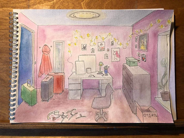 Дальше была основа рисунка: разница карандашей, как держать руку, перспектива и так далее. Лекция получилась чуть ли не на три часа. Было много полезной информации, но воспринимать ее так долго было сложновато. Я подозреваю, что если Сфера будет повторять такой курс, эту лекцию могут разбить на две. В качестве домашнего задания нужно было нарисовать своё пространство (комнату), которое вас репрезентует. Совершенно не обязательно было срисовывать с натуры и не обязательно свою настоящую комнату. Я рисовал акварелью, и у меня получилась смешанная комната: что-то из детства, что-то из текущего жилья, а что-то просто символическое.