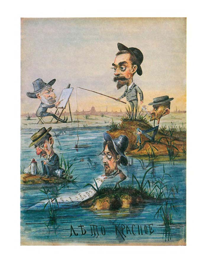 «Рисунок изображает летний отпуск театральной дирекции на петербургских островах, где у всех изображенных, кроме А.П.Фролова и П.И.Бабина, были дачи, свои или съемные. Управляющий театральным училищем А.П.Фролов остался на берегу, занимаясь живописью, в коей он был дилетант, а чиновник особых поручений П.И.Бабин присоседился к слывшему дамским угодником заведующему монтировочной частью П.П.Домерщикову, ловящему удочкой русалок, и предался любимому занятию — ничегонеделанию. И.А.Всеволожской на отдельном острове уселся в печальной позе и страдает катаром желудка, окружив себя лекарствами, а деятельный В.П.Погожев, славящийся терпением и трудолюбием, полощет в воде какой-то очередной проект. Характерно для Всеволожского, что он изображает Петербург как болотную трясину, а персонажей театральной жизни, в том числе и себя, — как болотных обитателей. Изнутри для него театр — царство пресмыкающихся»