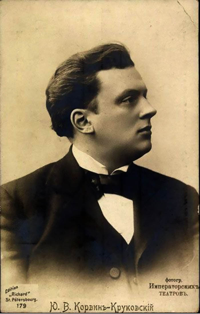 Юрий Корвин-Круковский (1862 – 1935) происходил из польского дворянского рода, выпускник Морского кадетского корпуса, актёр-самоучка. В 1883 году бросил военную службу и начал заниматься сценической деятельностью, играл на частной сцене под псевдонимом Юрин. В 1883 – 1886 играл в клубах: Благородное собрание, Купеческий клуб. А также в государственных театрах: театр Гельсингфорса (Хельсинки), Измайловский театр К. Н. Незлобина. В 1886 году Корвин-Круковский уже под своим именем дебютировал в Александрийском театре в роли Григория Радищева в пьесе «Злоба дня», здесь играл до 1929 года, когда вышел на персональную пенсию. Знаток театрального костюма, Корвин-Круковский принимал участие в оформлении множества спектаклей Александрийского театра. С 1919 года также работал заведующим историко-художественной частью театра. В 1921 году получил звание «Заслуженный артист РСФСР». Даже после выхода на пенсию в 1929 году продолжал сотрудничать с театром, в 1930 году вел с работниками Александрийского театра занятия по истории костюма. Умер 25 октября 1935 года и был похоронен на Никольском кладбище. В 1951 году перезахоронен в Некрополе мастеров искусств Александро-Невской лавры, где в 1958 году было установлено надгробие с неверным годом рождения: указан 1864 вместо 1862.