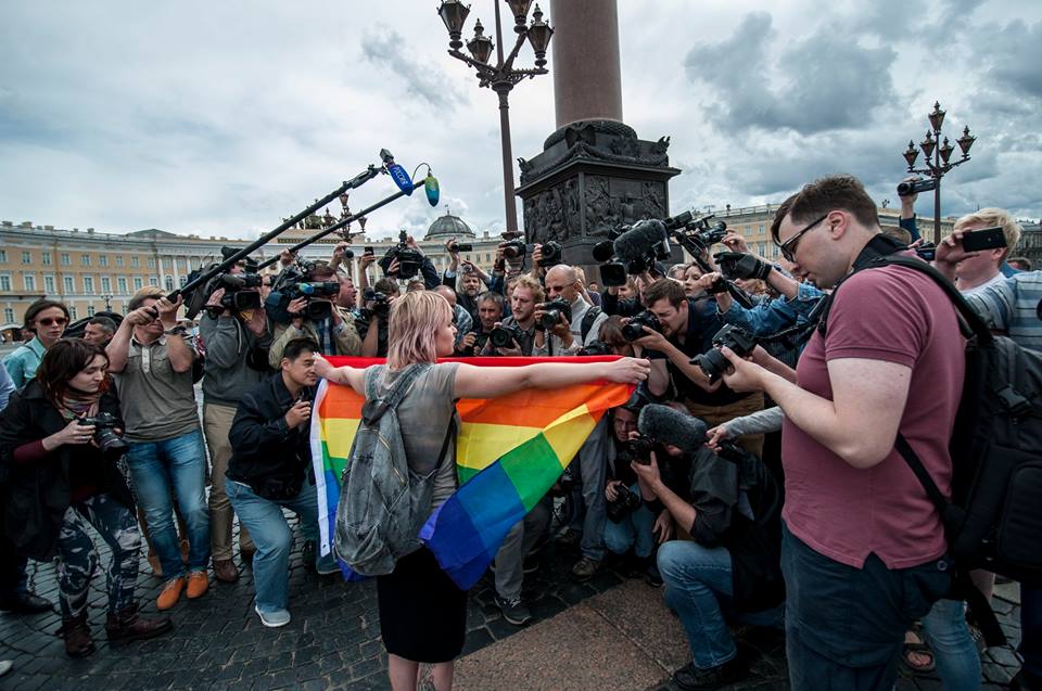 На Дворцовой уже были десятки журналистов, полиция, акцию снимала даже группа азиатских туристов. Тогда стало спокойней — при таком стечении народа и видеофиксации, вряд ли полиция и десантники станут сильно «выходить из берегов». Поддерживало и то, что среди толпы вокруг было немало знакомых лиц ЛГБТ-людей. Сами они не стояли в пикетах, но их присутствие добавляло спокойствия.
