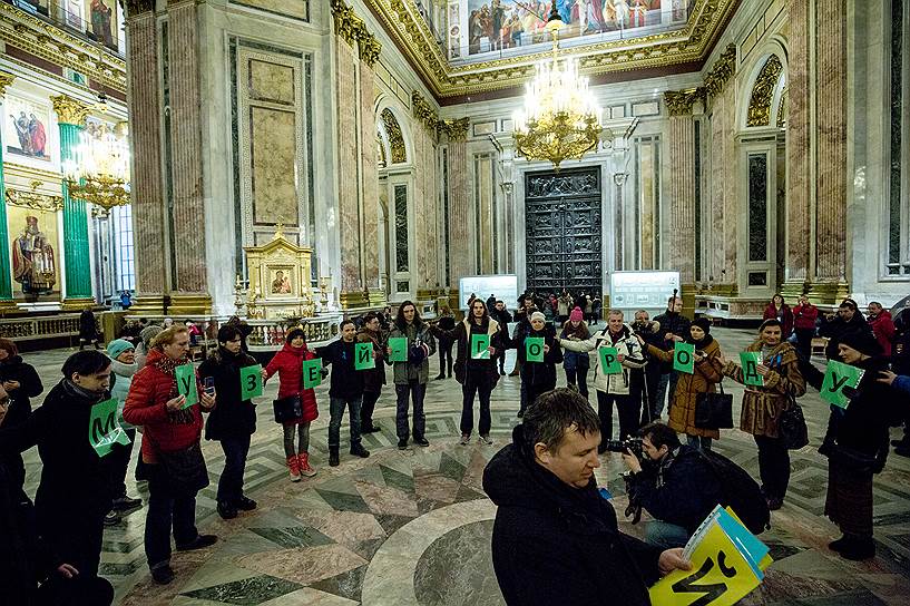 На последнем чтении «Свидетелей Конституции» в Петербурге стоит остановиться подробнее. В январе 2017 года, после новогодних праздников, губернатор Петербурга объявил о передаче Исаакиевского собора Русской Православной Церкви. Его слова о том, что это «вопрос решенный» — возмутили многих петербуржцев. Исаакиевский собор — не только символ города, но и успешный музей, зарабатывающий почти миллиард рублей в год. Большая часть этих средств тратится на содержание, реставрацию и научную деятельность, но музей также платит налоги в городской бюджет. При этом храм действующий, в нем проводятся богослужения, церковным служащим и прихожанам никто не препятствует. Понятно, что при передаче все доходы утекли бы в руки РПЦ, научная деятельность была бы свернута, а реставрационные работы, вероятно, пришлось бы оплачивать городу. Больше всего жителей возмутило то, что такое важное решение принималось без учета мнения петербуржцев.