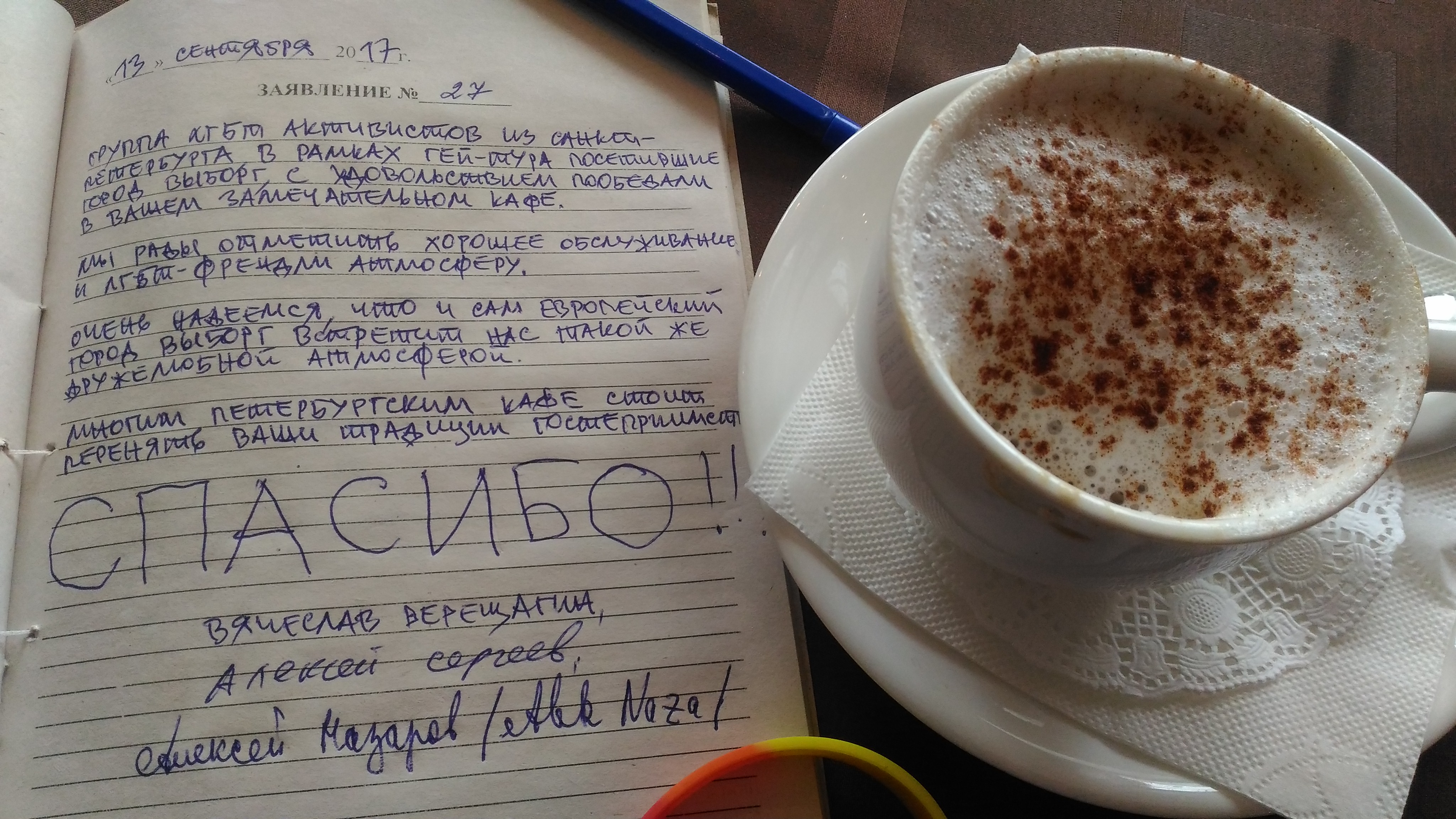 По прибытию в Выборг, ЛГБТ-активисты сначала ели в местном кафе, о чём оставили позитивный отзыв в книге жалоб и предложений, прогулялись по историческому центру с древней историей, а потом посадили деревья.