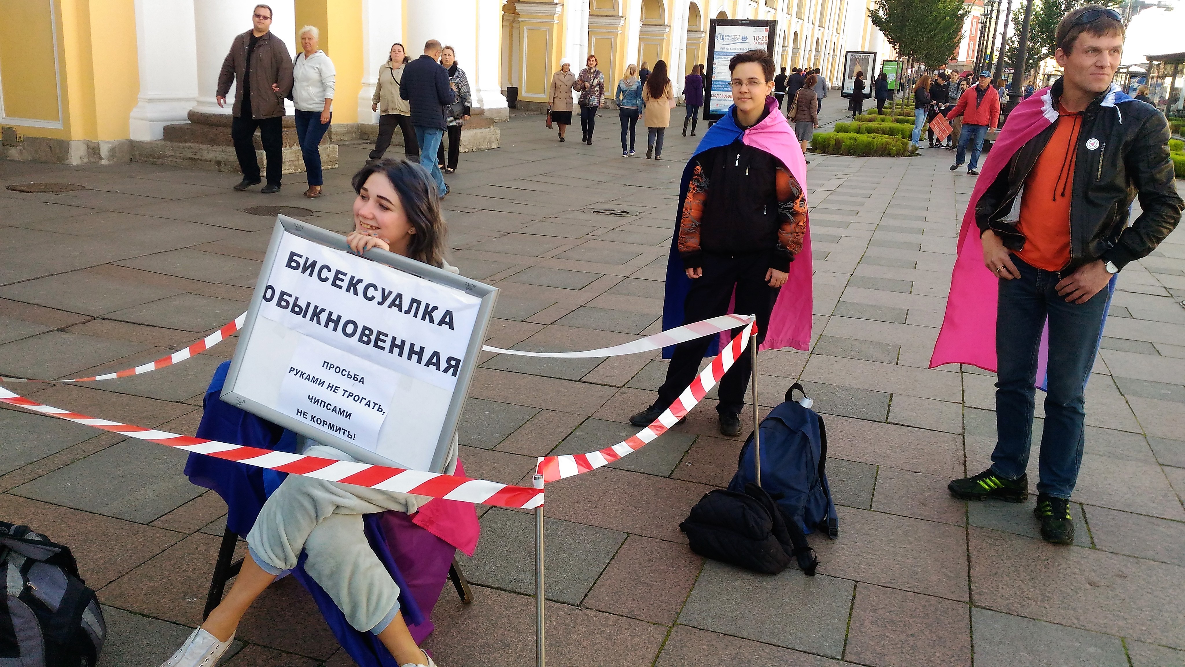 Потом следовал интерактивный перформанс с сидящей за ограждением активисткой в костюме животного («бисексуалка обыкновенная»), привлекающей внимание к стереотипу о распущенности и «всеядности» бисексуальных людей.