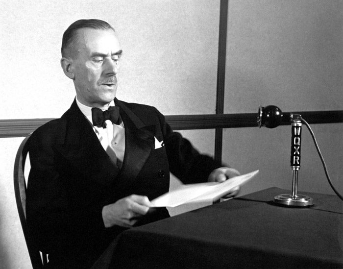 Бывшие соратниками Томаса Манна правые сделались его главными врагами. За антифашистскую деятельность книги Манна сжигали, чем он очень гордился. Самого писателя лишили гражданства и выслали из страны вместе с семьёй, как только НСДАП пришла к власти в 1933 году. После скитаний по Европе часть семейства Манна осела в США, в 1939 году Томас Манн получил американское гражданство. С 1940 года писатель делал записи для радиоэфиров, направленных на немецкую аудиторию, назывались его эфиры «Deutsche Hörer!» («Немецкие слушатели!»). Записи были от пяти до восьми минут, их Манн отправлял в BBC, которая транслировала их на территорию Германии. Вот фрагмент одной из них.