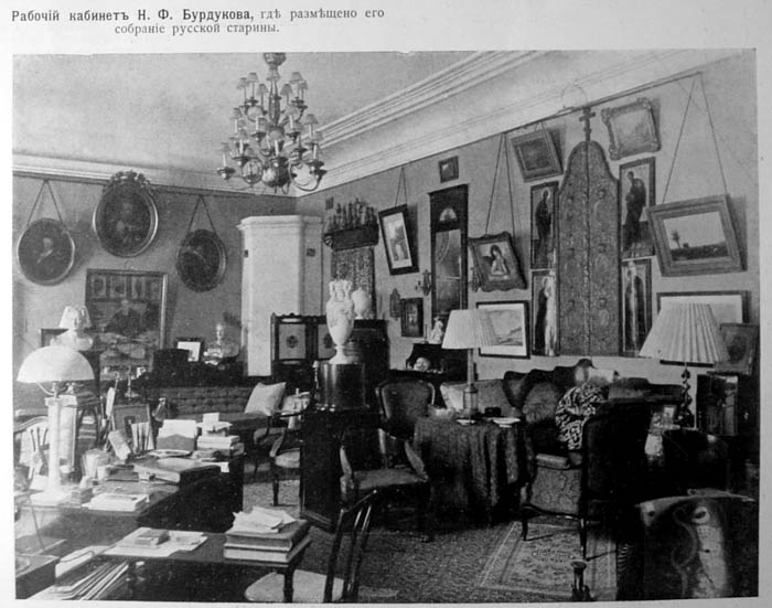 Будучи большим любителем всякой старины, Н. Ф. Бурдуков собирает различные предметы минувших эпох и его обширный кабинет является ценным собранием старой — Александровской и Николаевской эпох — мебели, разного вида прежних штофов, стекла, материй, икон, фарфора, картин и портретов».