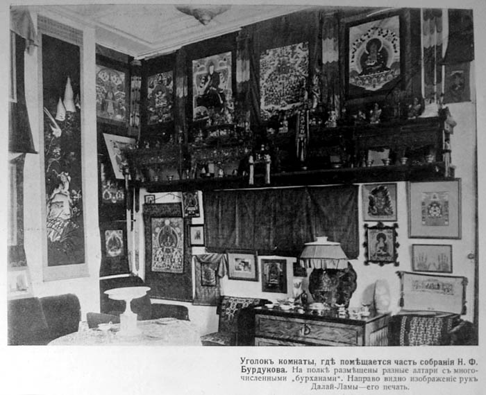 Будучи сам знатоком и любителем восточных ковров, Н. Ф. Бурдуков совершал продолжительные путешествия по Средней Азии, Персии и Афганистану с целью изучения на месте коврового производства и способов поддержания и развития в населении Закаспийского края этой отрасли. Собранная во время этих поездок значительная коллекция ковров является весьма ценной как по количеству, так и по высокому техническому и художественному исполнению. <…> Необыкновенно удачно гармонирует с коврами и собрание священных изображений буддийского культа. Большие и малые, серебряные и бронзовые сидят бесстрастные боги востока с подогнутыми коленями на украшенных тончайшею ажкрною резьбою алтарях, окруженные священными предметами – четками из редких камней, бронзовыми колокольчиками, курильницами и другими божественными атрибутами. Среди великолепных вышивок и рисунков, сплошь покрывающих стены «восточной комнаты», особо редкостной является, полученная как высшее благословение, печать руки Далай-Ламы на тонком голубом шелку.