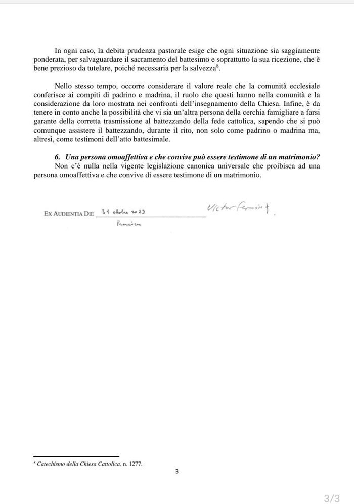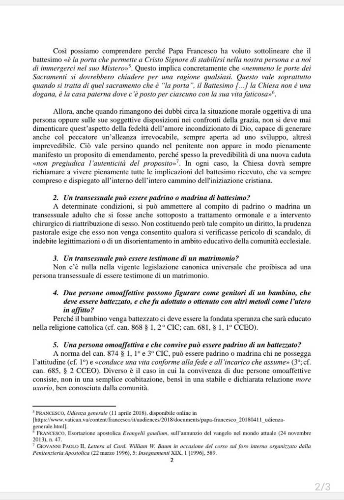 Документ также указывает, что человек, совершивший трансгендерный переход, может стать крестным отцом или матерью при определенных условиях. Опять же, если нет опасности вызвать скандал в местной церковной общине. Также документ отмечает, что в церковном законе нет запрета для трансгендерных людей или гомосексуалов на роль свидетелей при заключении брака.