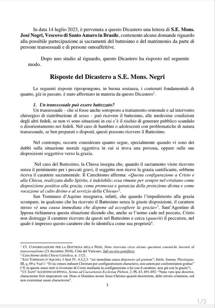 Согласно заявлению, взрослый человек, идентифицирующий себя как трансгендерная персона, может принять таинство крещения наравне с другими взрослыми при условии, что его действия не вызовут скандала в местной общине. Дети или подростки, которые испытывают гендерную дисфорию, также могут быть крещены, если они хорошо подготовлены и выражают желание.