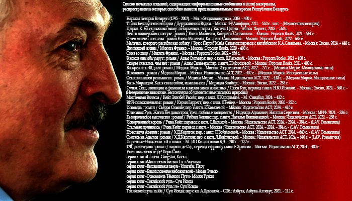 21 ноября 2024 года Республиканская комиссия по оценке символики и информационной продукции приняла решение о запрете распространения 35 печатных изданий на территории Республики Беларусь. Это решение стало очередным шагом к ужесточению цензуры и подавлению свободы слова в стране. Согласно информации, размещенной на сайте Министерства информации, в содержании этих изданий были выявлены материалы, которые, по мнению властей, могут нанести вред национальным интересам.