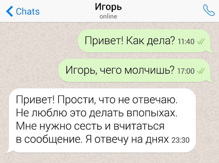 Если он написал в 3 часа ночи, то, возможно, он просто прибухнул или приспичило в интим. Но если он отправляет тебе сообщения в течение дня, желает доброго утра, спрашивает, как прошёл твой день, рассказывает забавные истории с работы, это уже нечто большее!