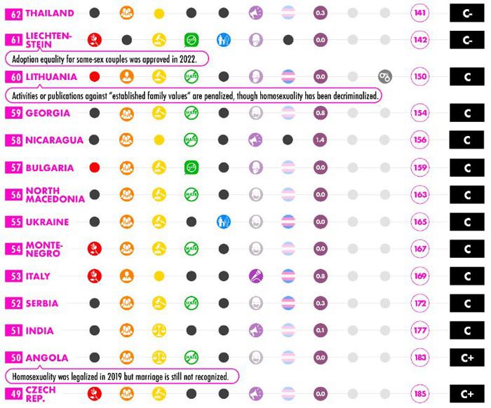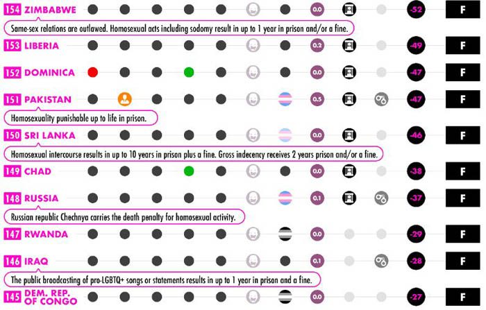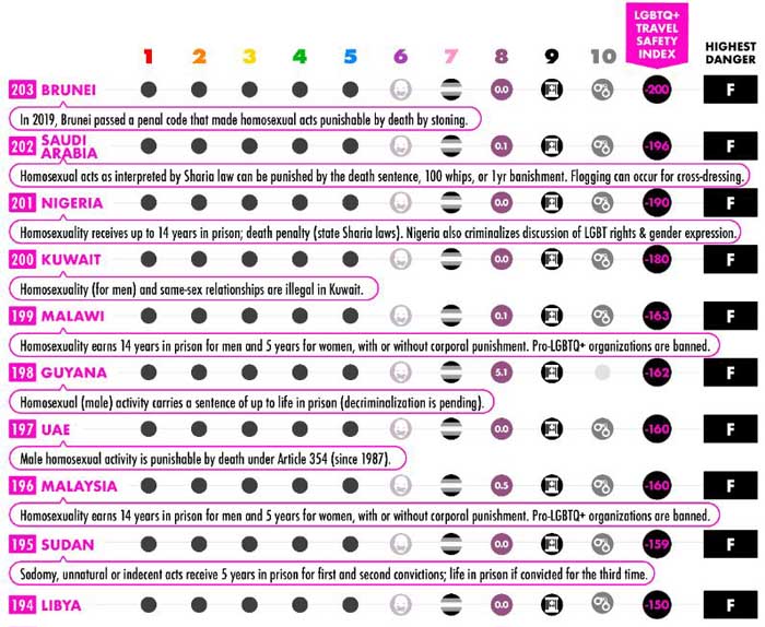 В десятке худших также Саудовская Аравия, Нигерия, Кувейт, Малави, Гайана, ОАЭ, Малайзия, Судан и Ливия. По большому счёту, все страны, где доминирует ислам и в целом сильна религия, крайне опасны для радужного туризма. Несмотря на то, что в некоторых из них (Малайзия, ОАЭ) существуют туристические резервации с более мягкими нравами, стоит воздержаться от их посещения. Уганда с её фашистскими законами оказалась на 176 месте.